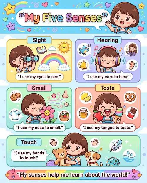 "Create an educational comic about the five senses for young learners. Use simple language, friendly characters, and clear visual examples."